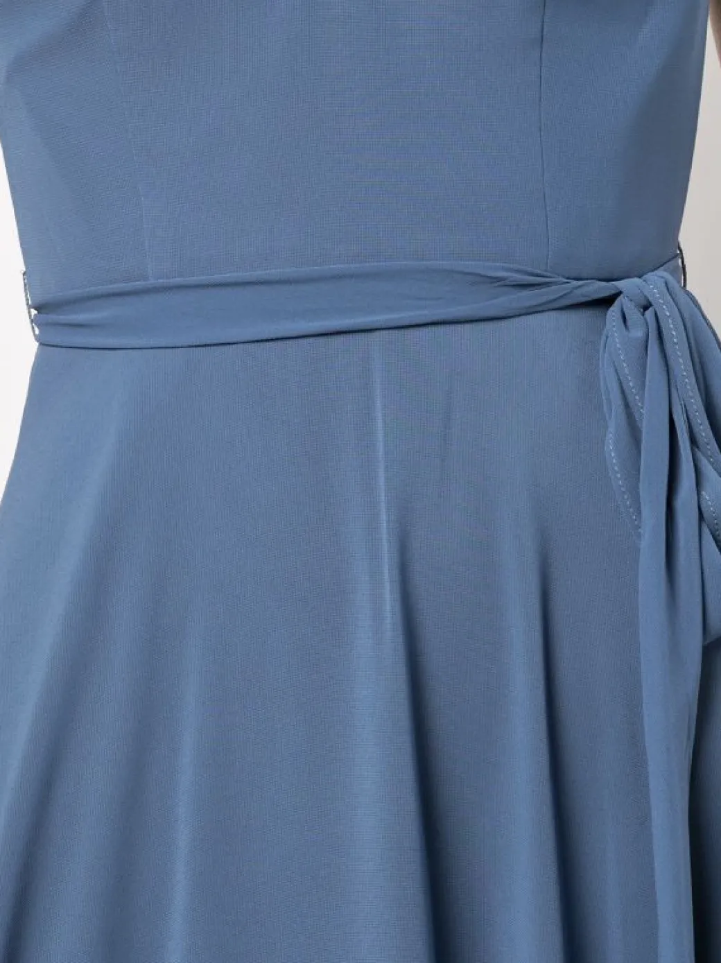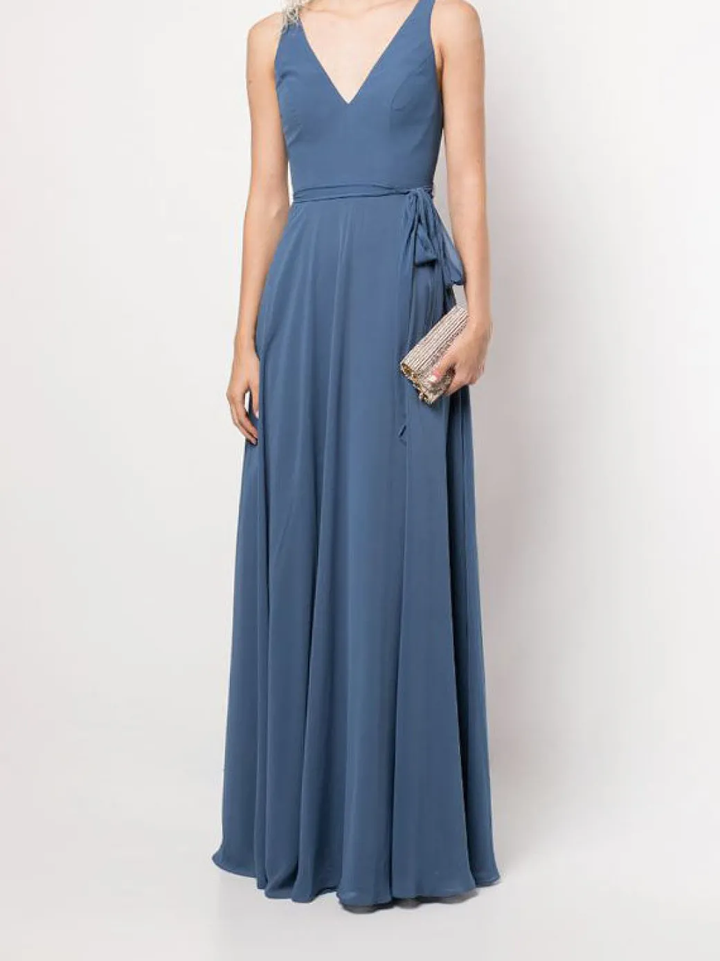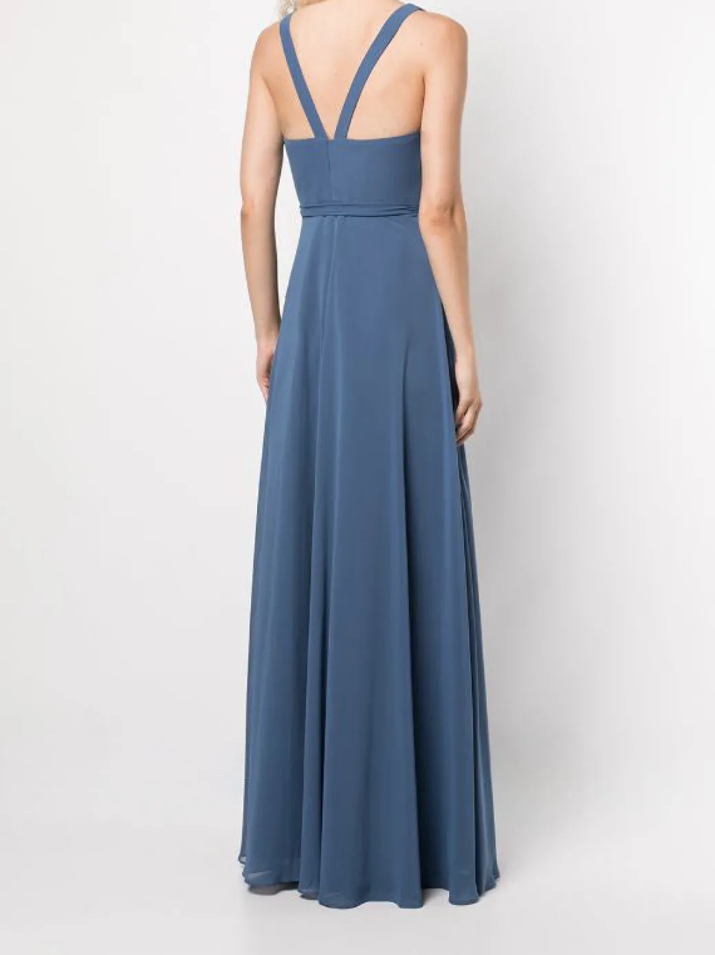 The Aprilia gown explores a hint of symmetry by mirroring the plunging neckline with the intersecting v-shaped back straps.Featuring a sleeveless plunging neckline, an a-line silhouette, and an elongated waist tie,this dress is subtly divine.