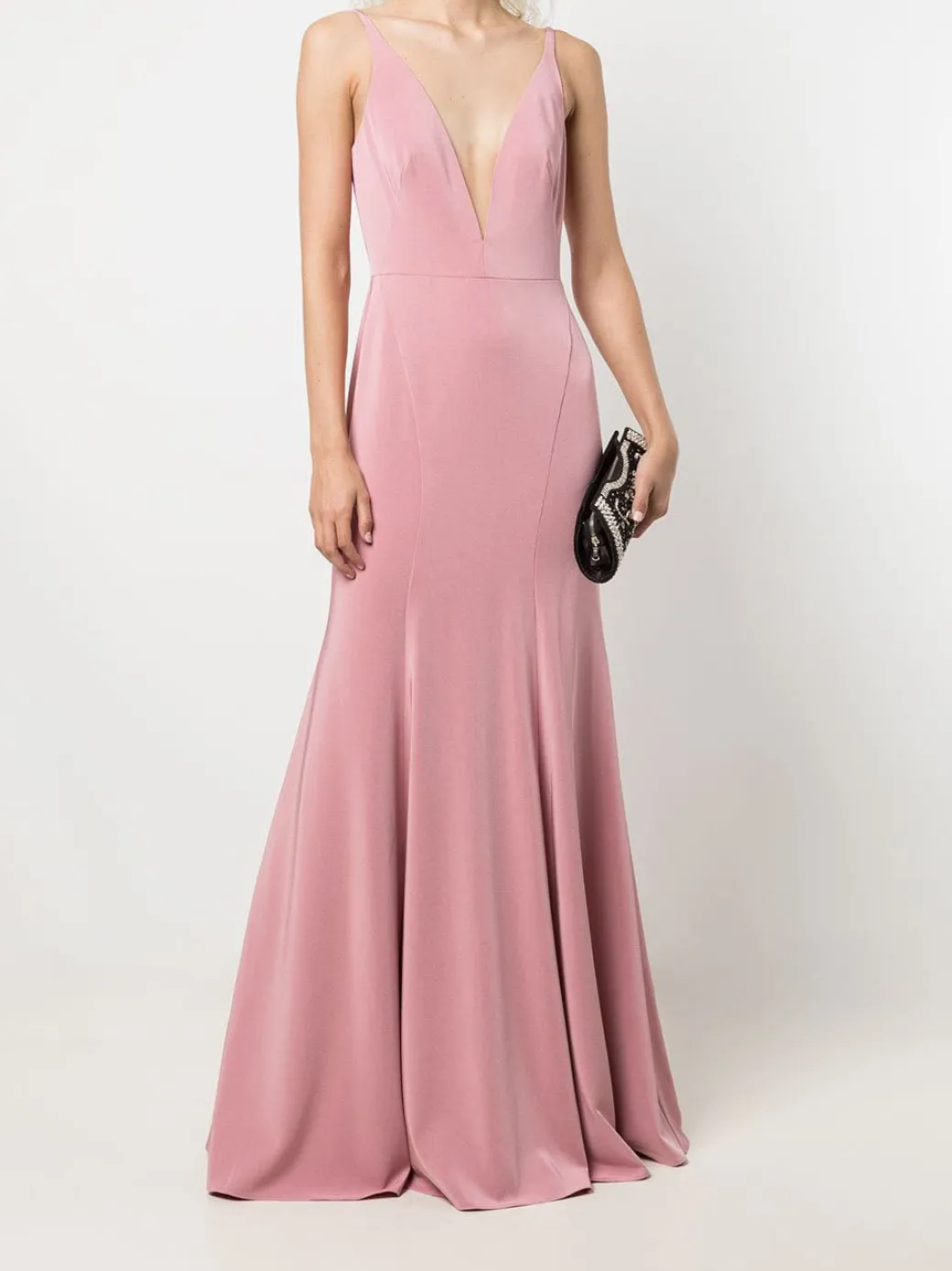The Crema gown in rose is simple and classy. The fit-to-flare gown features a deep v-neckline and a low-cut back. The flow of the fabric combined with a plunging neckline implies a subtle yet eye-catching feel.