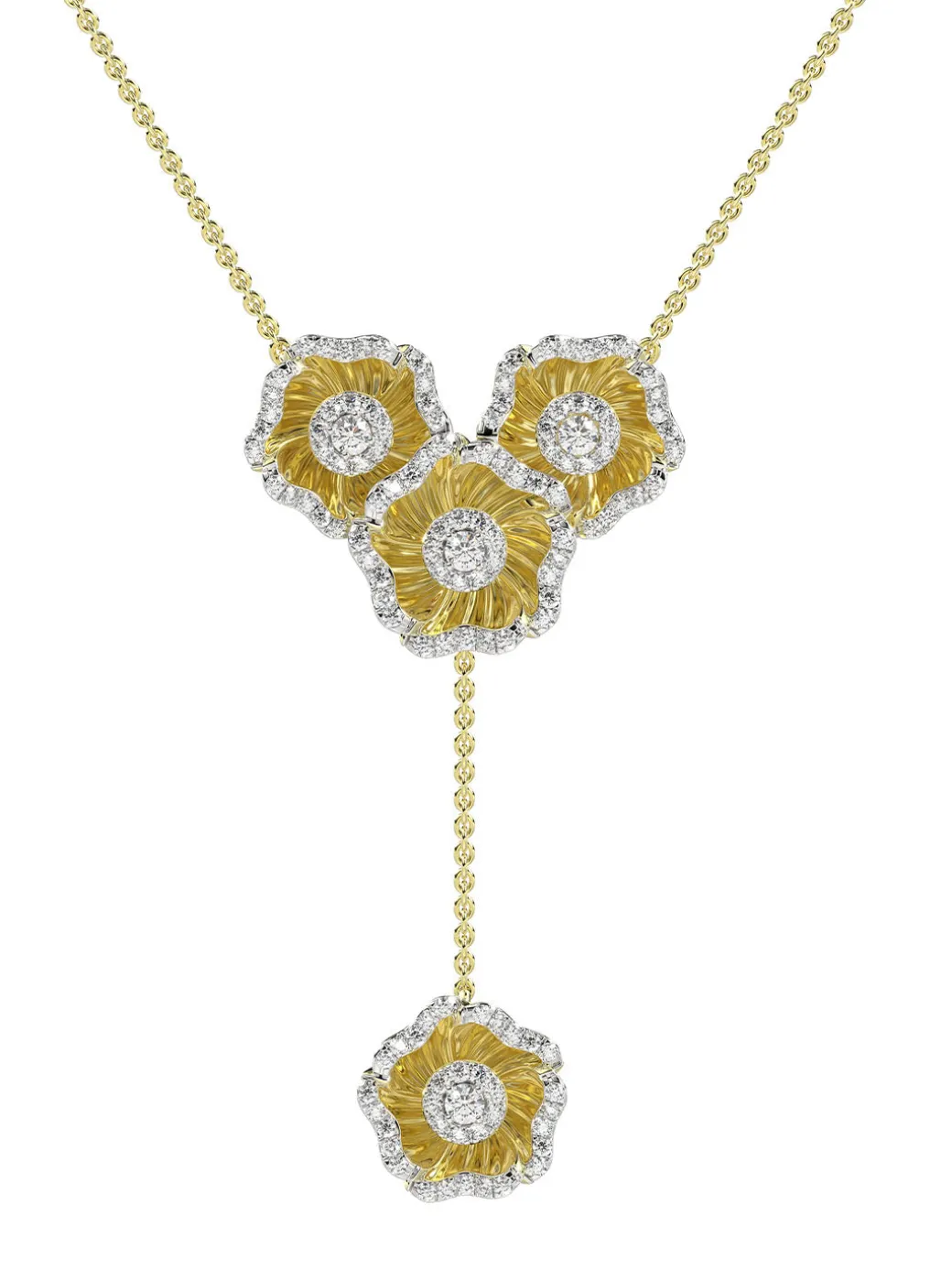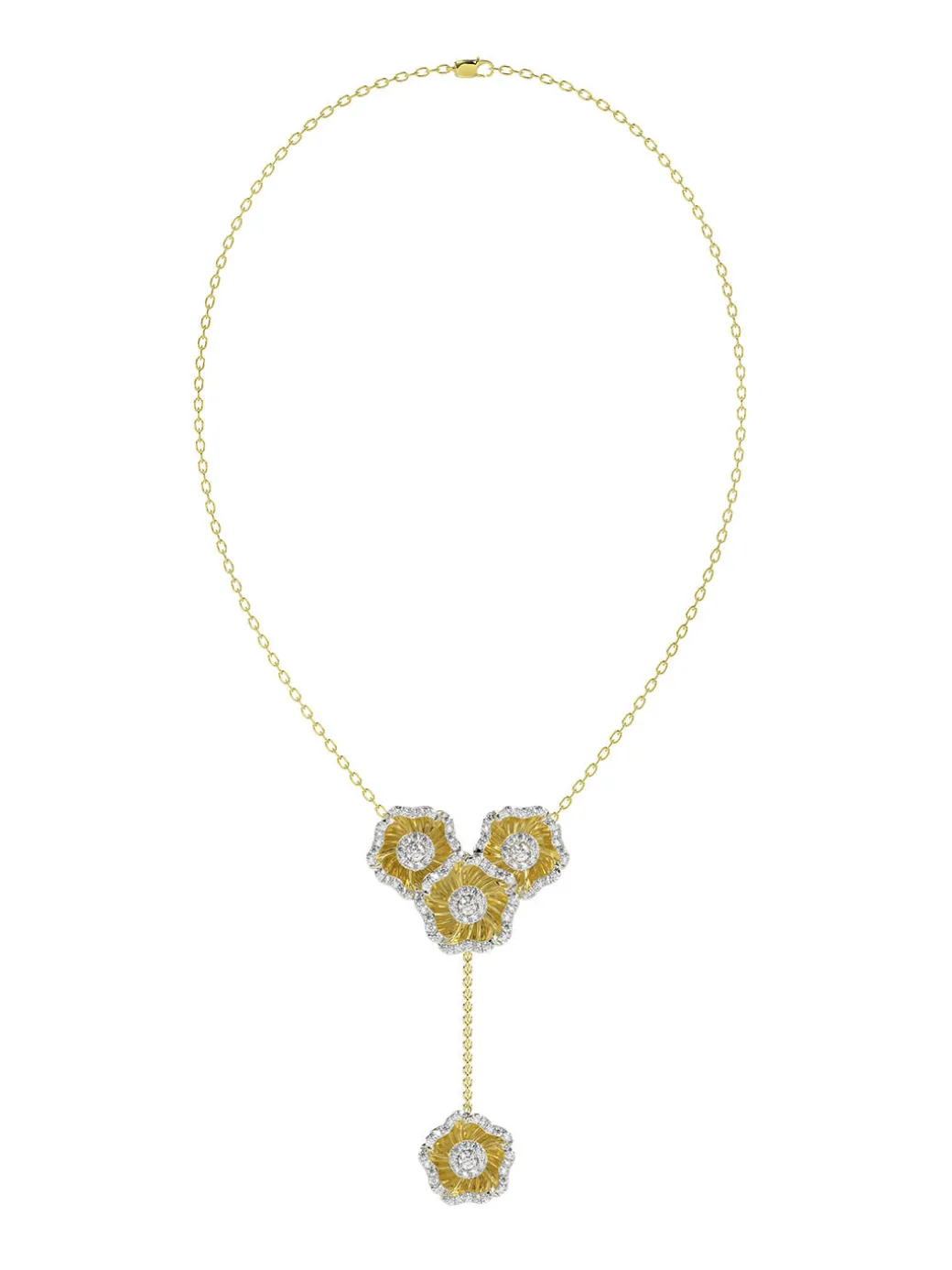 The Halo FlowerRose Gold Y Necklaceisan 18 karatrose golddelicate chainwith atrio of rose gold and natural diamond camellia-inspired flowers at its center. Afourth flower hangs by a rose gold chain.
