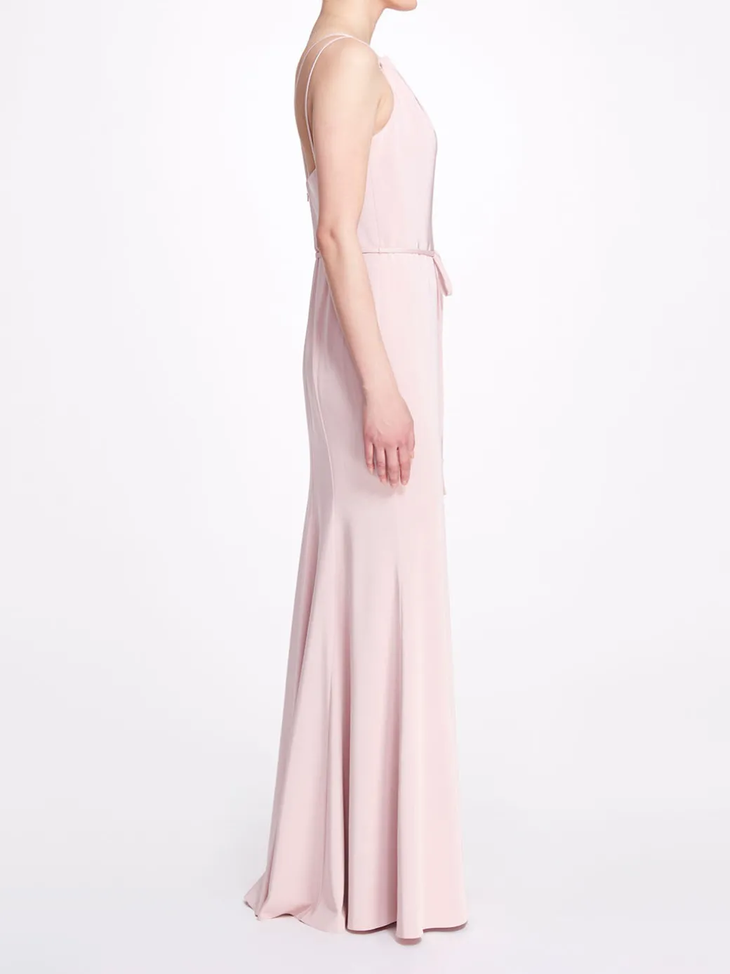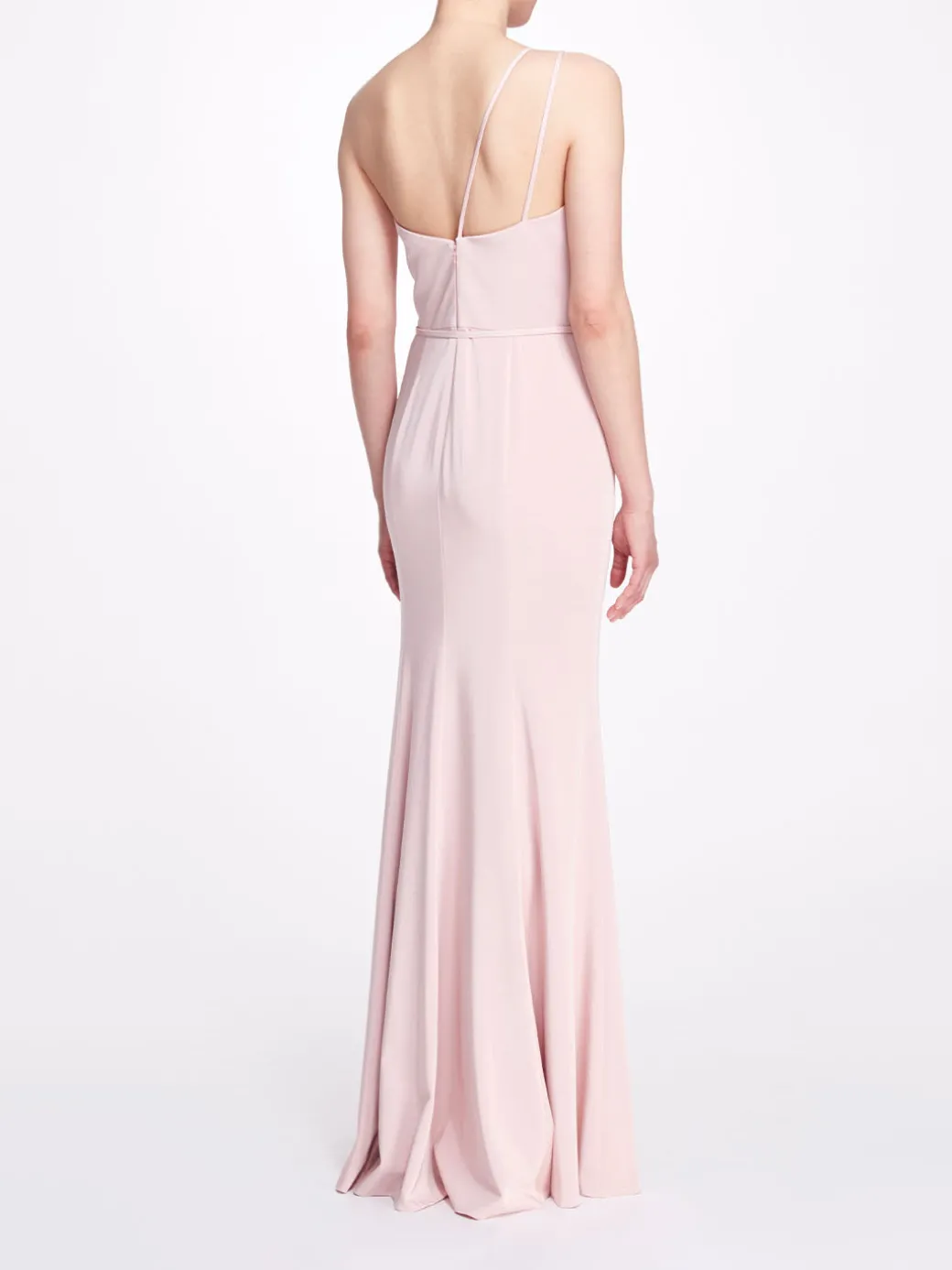 Bloom all year round in the Novara gown in blush. Featuring a refined one-shoulder design with a dainty double strap, a graceful waist tie, a subtle keyhole, and a classic front leg slit, this dress is chic and sleek.