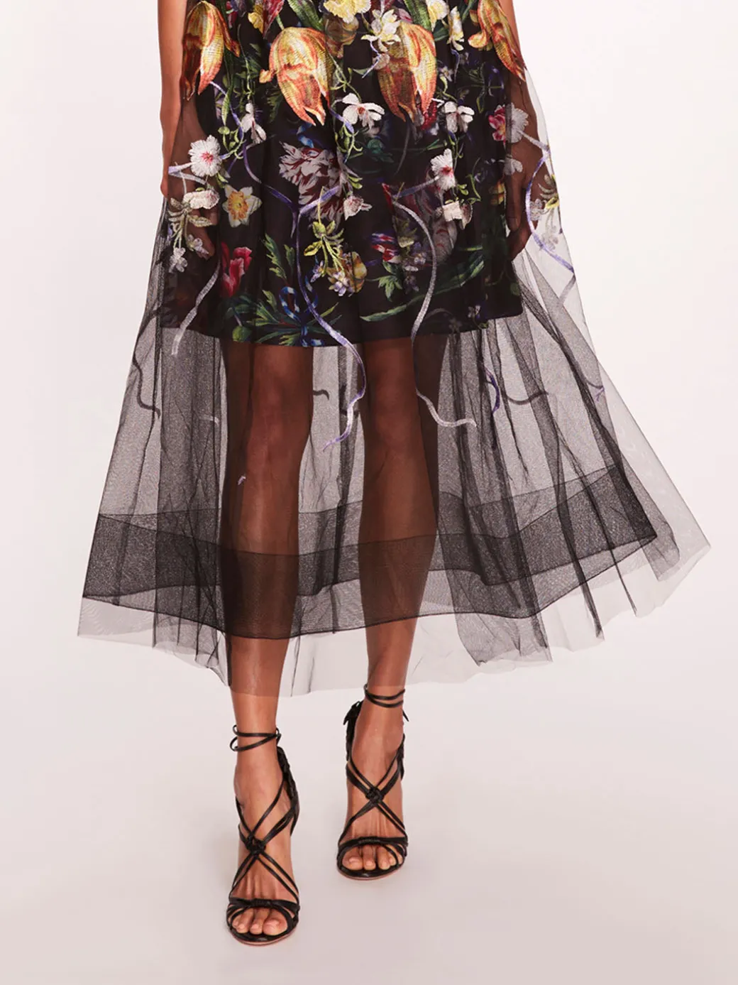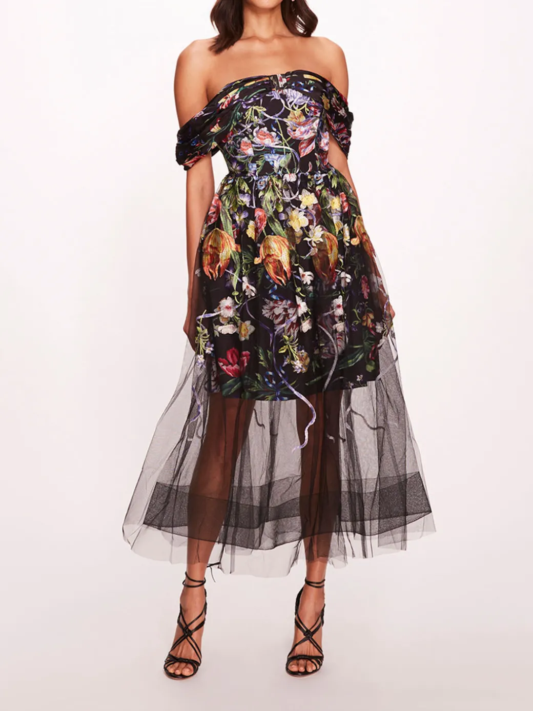 TheRibbons Midi Dress is an off-shoulder midi embroidery on tulle dress with draped sleeves.