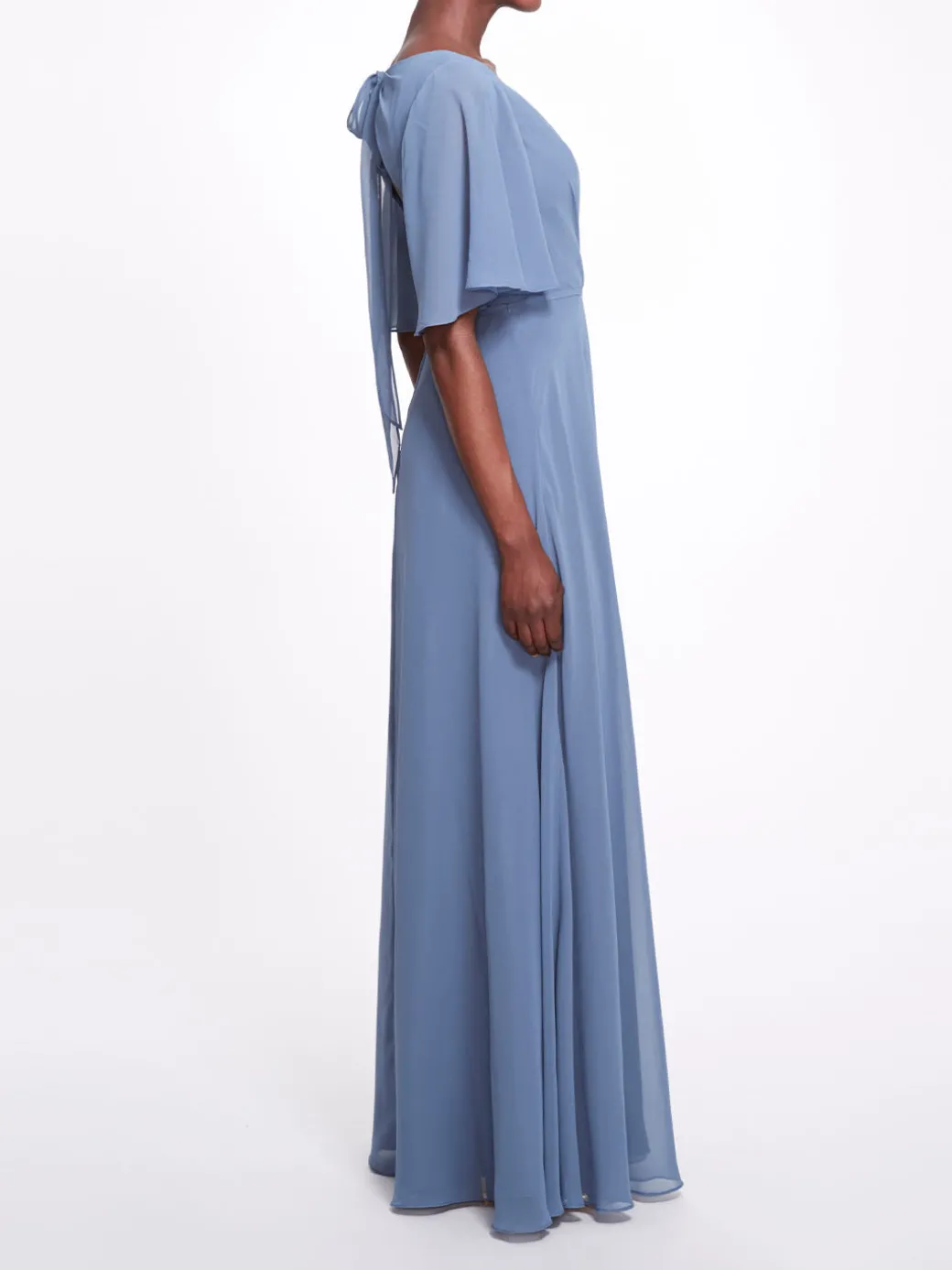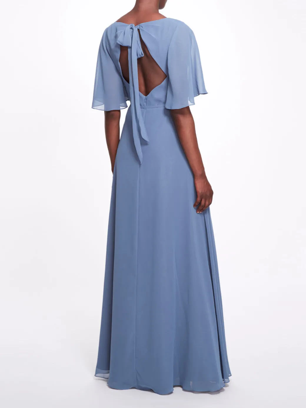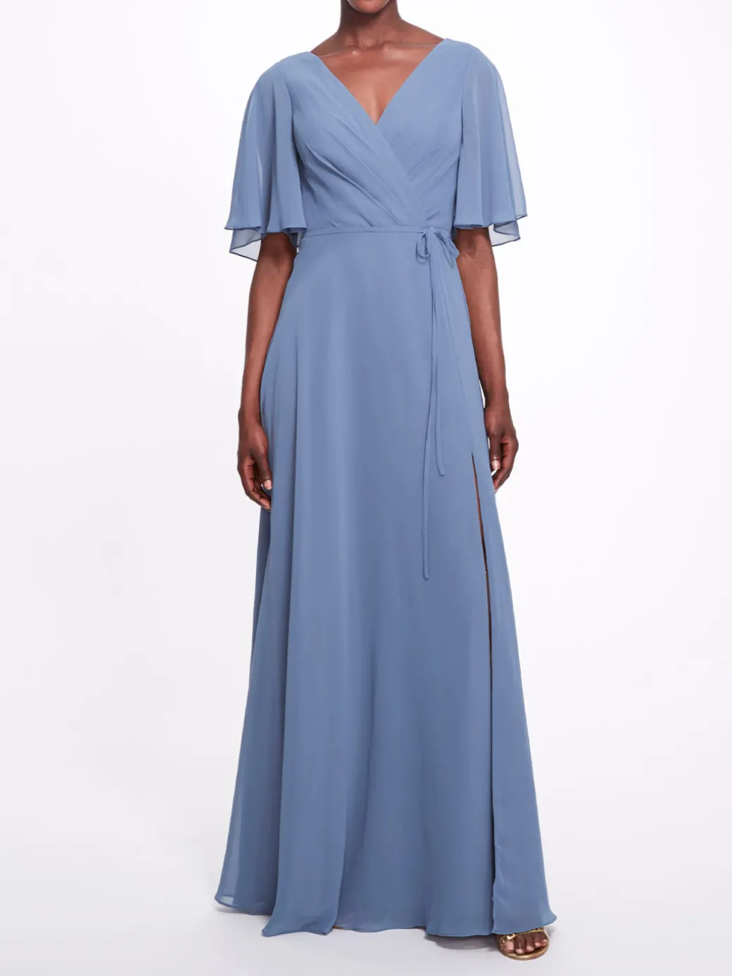 All eyes will be on you at your next event in the Rome gown. Featuring dreamy short flutter sleeves, a charming wrap neckline, an enticing open back with an enchanting bow, and a delightful leg slit, this dress will enchant any room.
