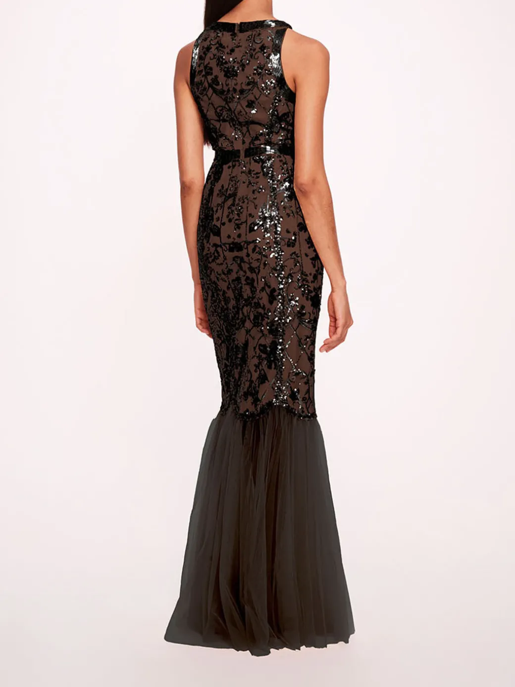 The Sequin Lattice Cape Gown features a stunning floor-length cape, adorned with intricate geometric floral lattice detailing. The combination of shimmering sequins and dramatic cape creates a bold yet elegant look, perfect for making a statement at any gala or formal event.