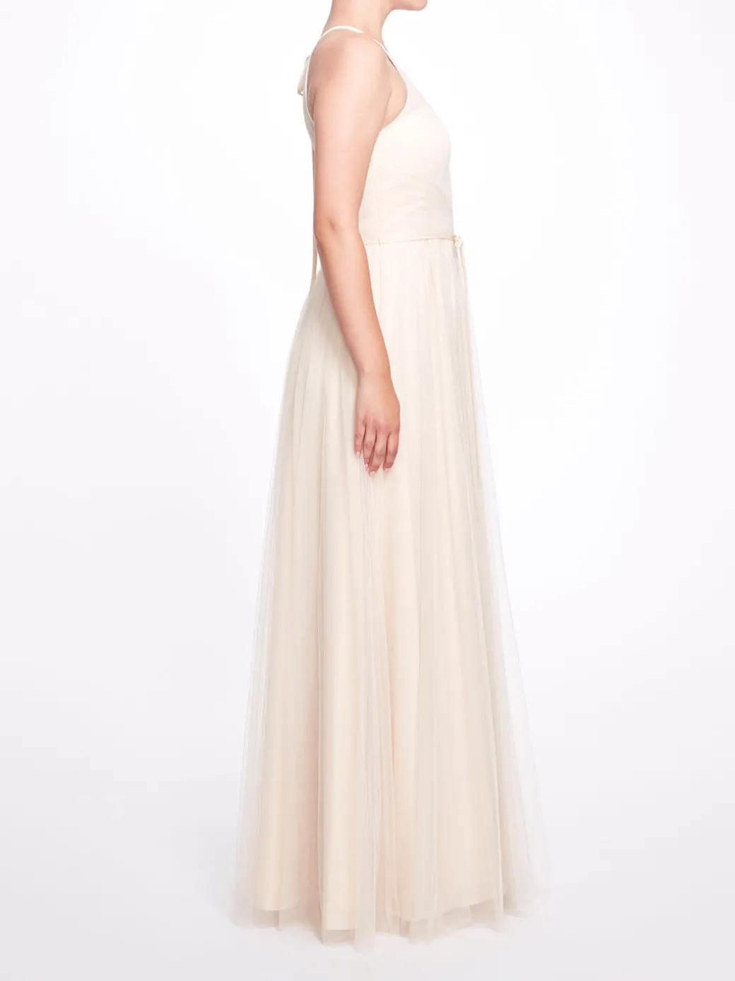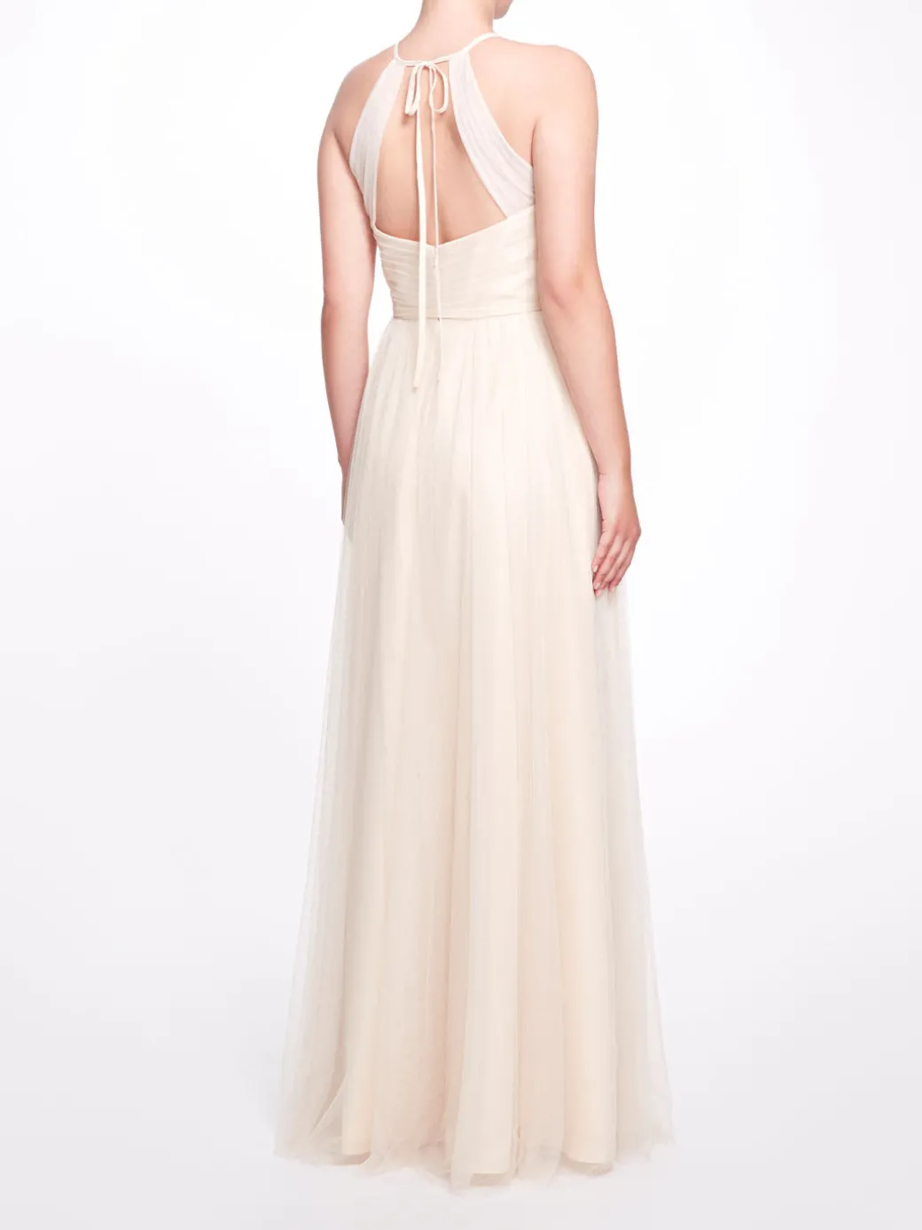 The Sicily gown in champagne is reminiscent of its namesake, a city in Italy. Featuring a halter neck, a-linesilhouette,tulle panels, a sheer construction, a waist tie, a back tie fastening, and an open back, this dress is elegant and heavenly.