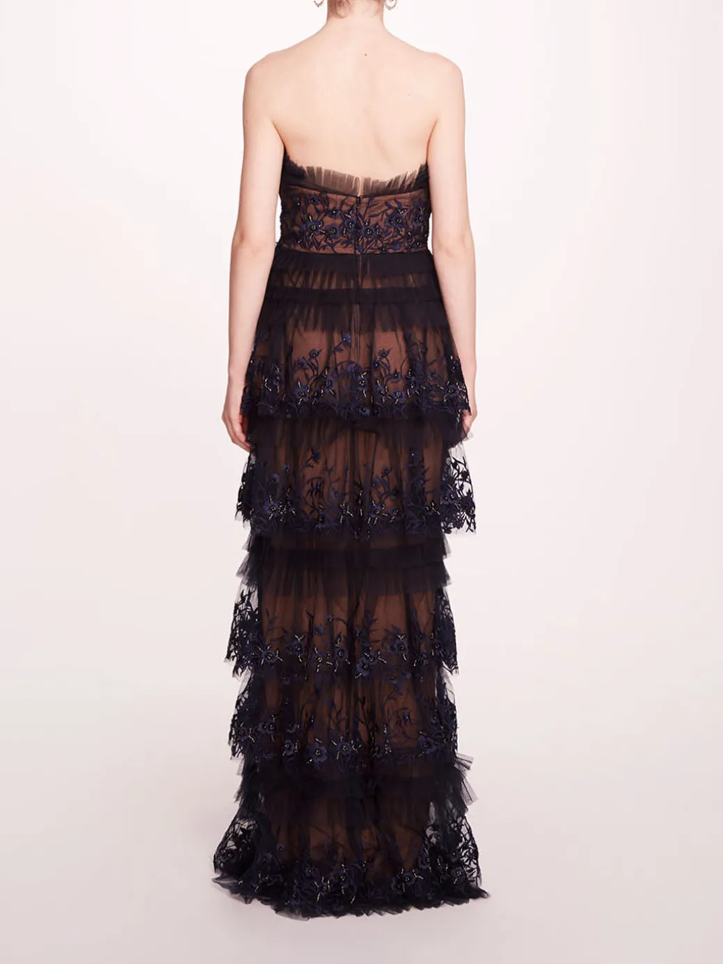 Step into enchanting elegance with the Tiered Terrarium Column Gown, featuring a strapless design adorned with intricate terrarium embroidery on delicate tulle. The ethereal tulle pleated neckline adds a whimsical touch, while the tiered silhouette gracefully flows to create a captivating profile.