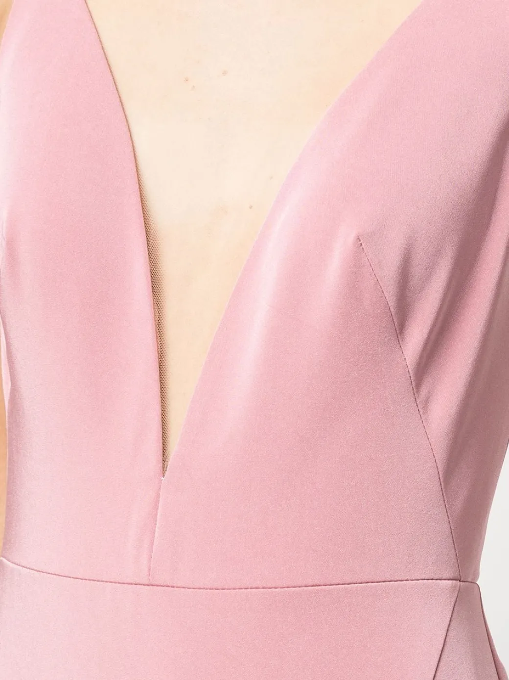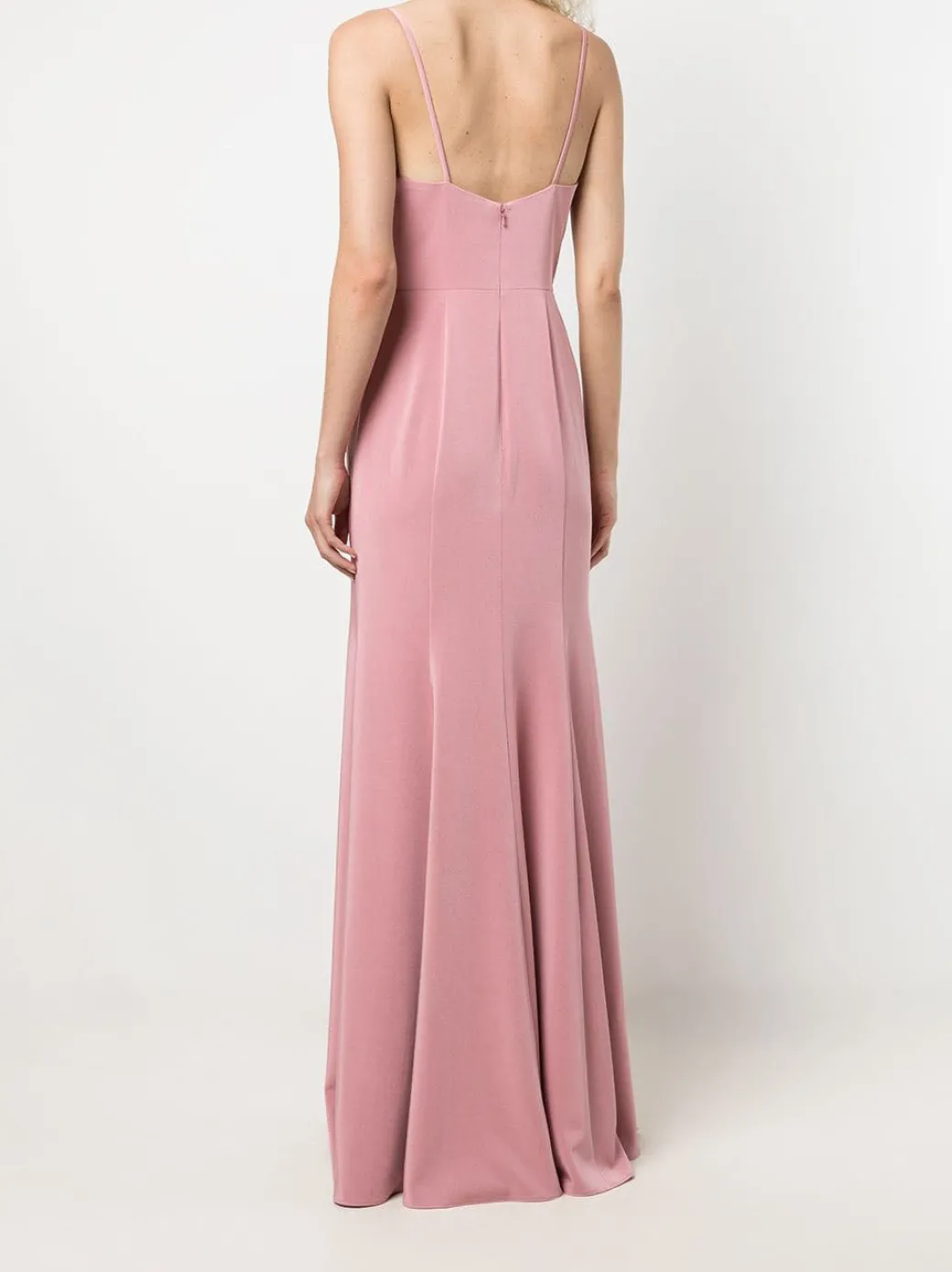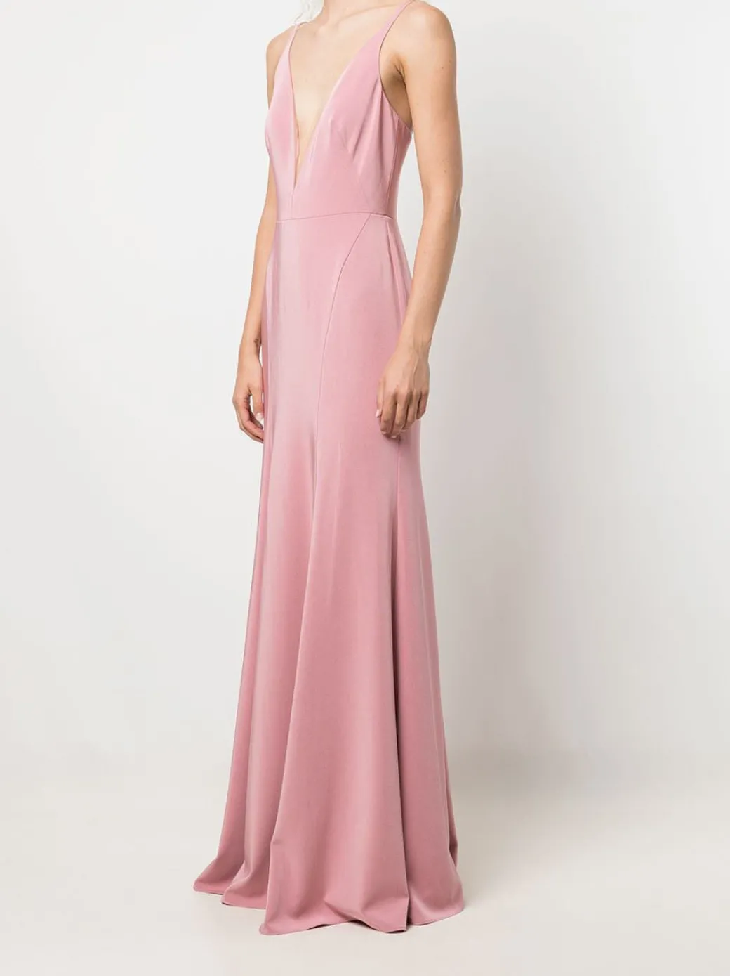 The Crema gown in rose is simple and classy. The fit-to-flare gown features a deep v-neckline and a low-cut back. The flow of the fabric combined with a plunging neckline implies a subtle yet eye-catching feel.