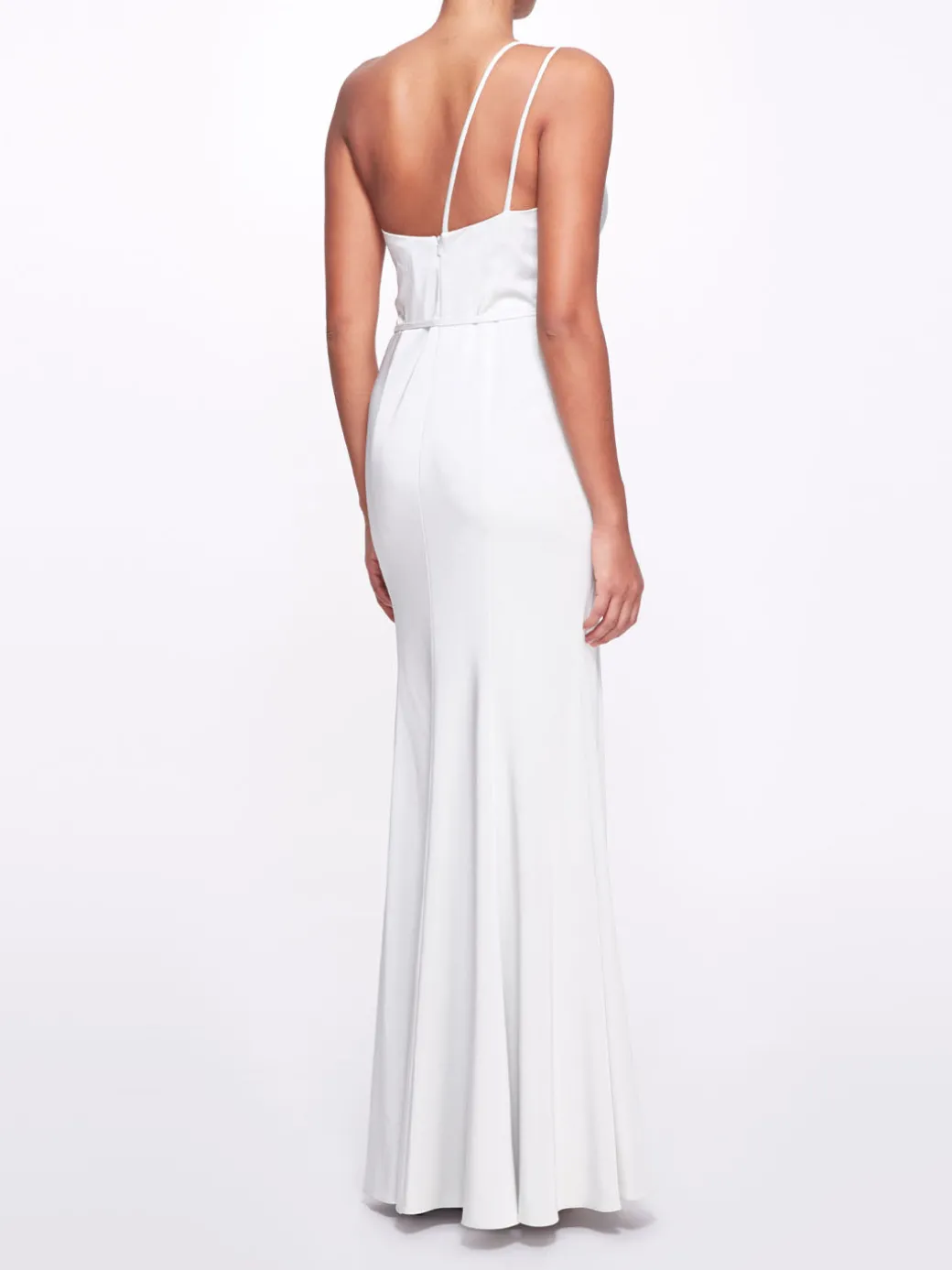 Bloom all year round in the Novara gown in dove grey. Featuring a refined one-shoulder design with a dainty double strap, a graceful waist tie, a subtle keyhole, and a classic front leg slit, this dress is chic and sleek.
