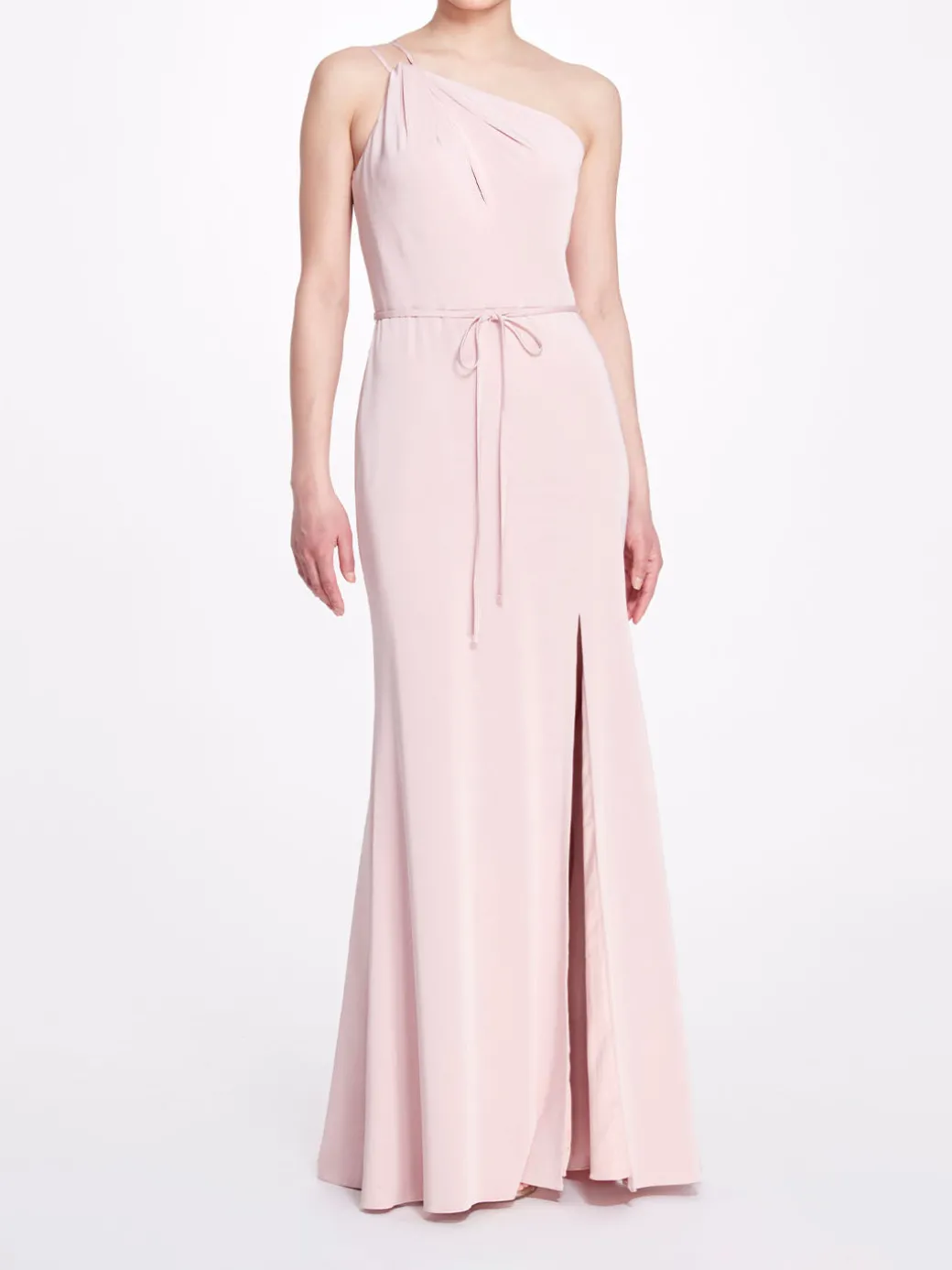 Bloom all year round in the Novara gown in blush. Featuring a refined one-shoulder design with a dainty double strap, a graceful waist tie, a subtle keyhole, and a classic front leg slit, this dress is chic and sleek.