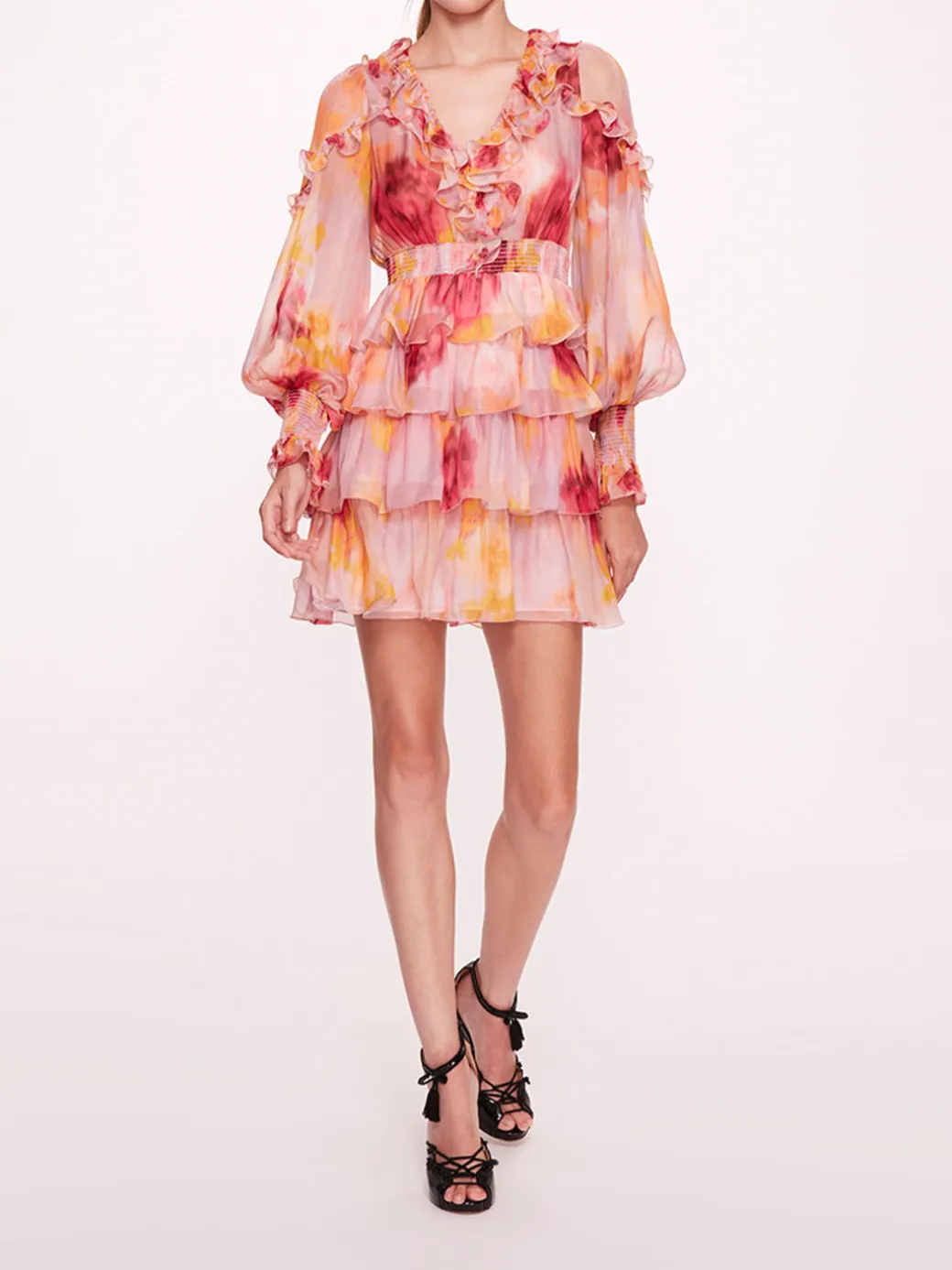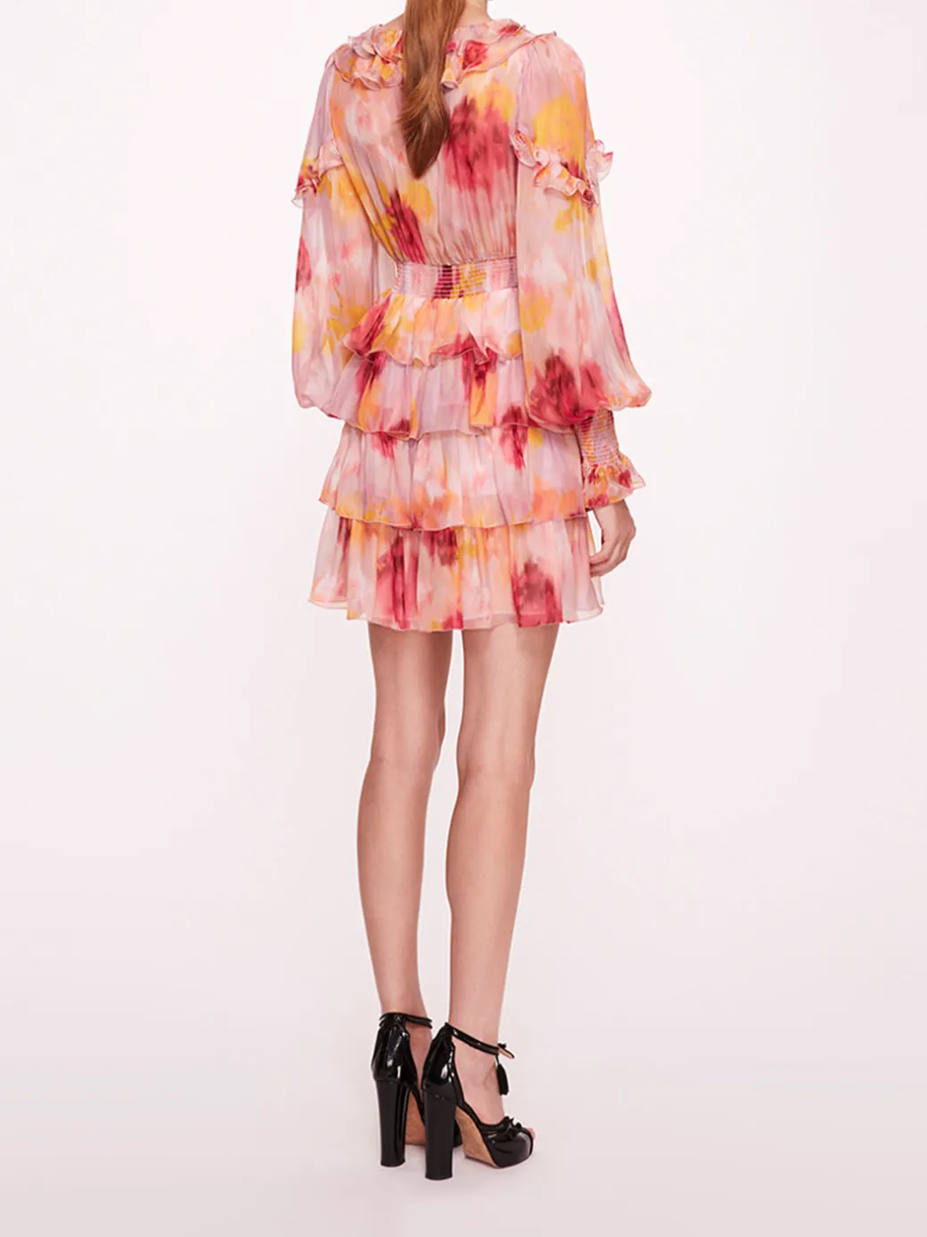 The Orchid dress is a v-neck domain sleeve ruffled tiered mini dress in silk