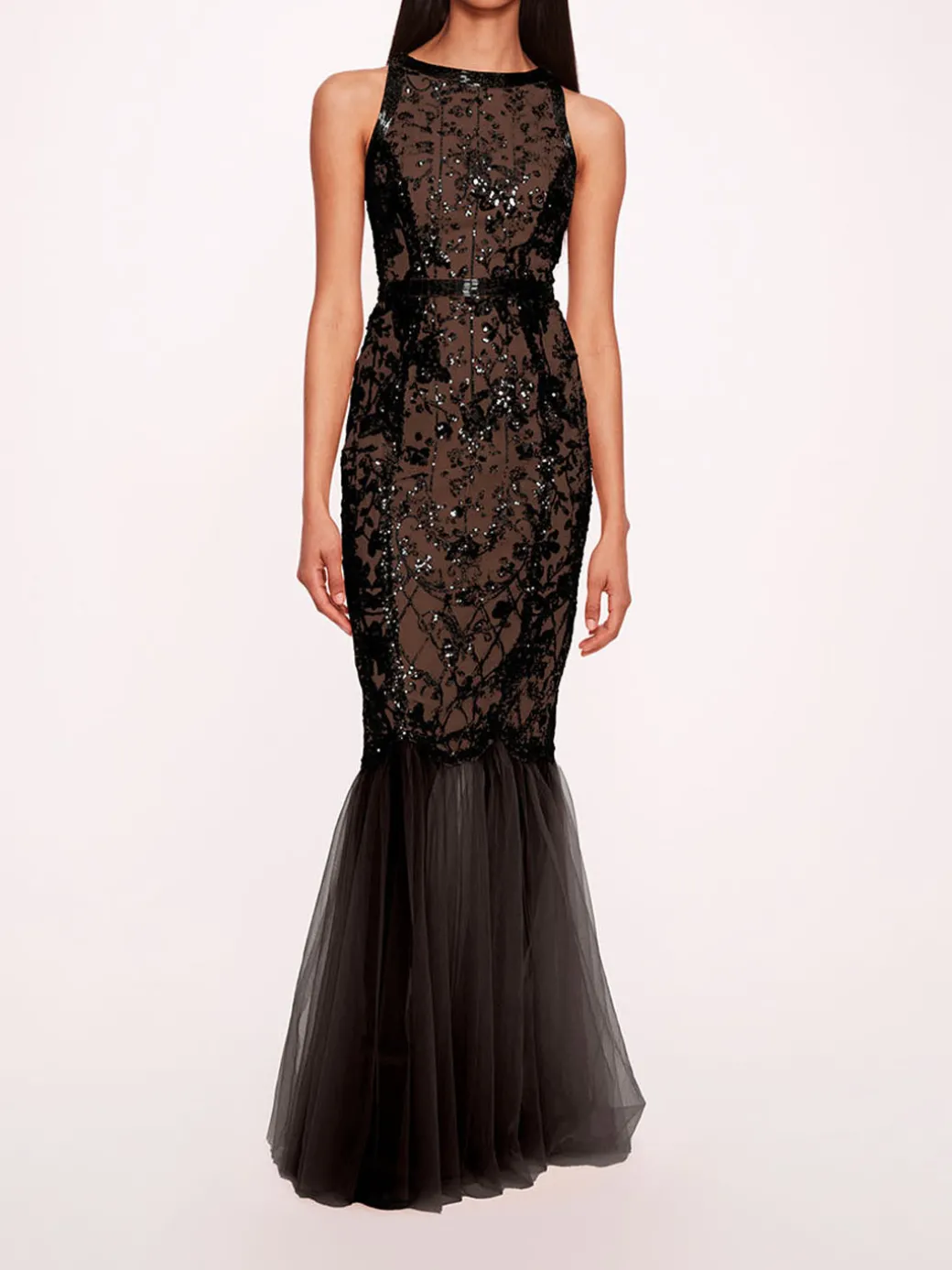 The Sequin Lattice Cape Gown features a stunning floor-length cape, adorned with intricate geometric floral lattice detailing. The combination of shimmering sequins and dramatic cape creates a bold yet elegant look, perfect for making a statement at any gala or formal event.